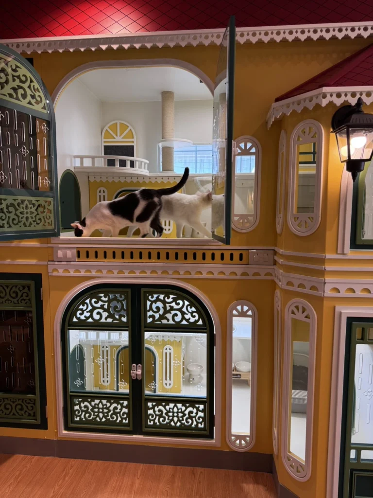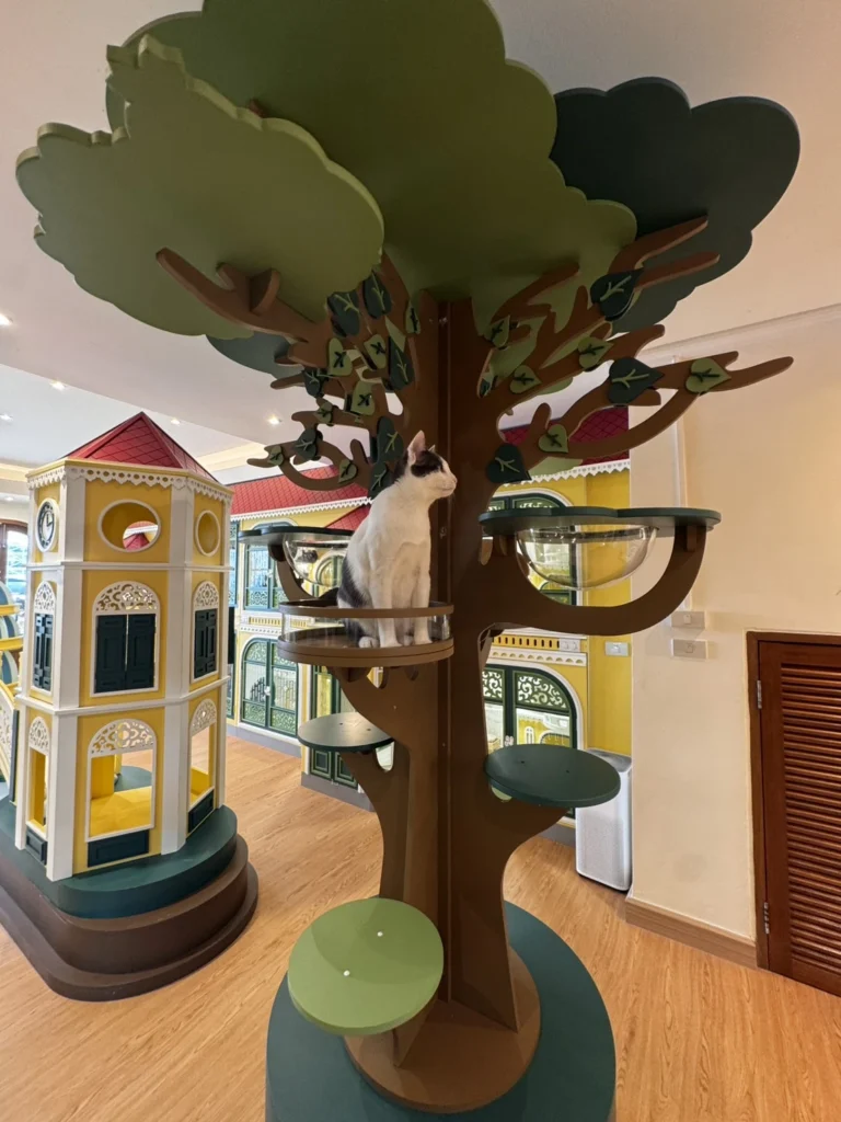 พื้นที่ภายในถูกออกแบบให้รู้สึกอบอุ่น สงบ และเป็นส่วนตัว ช่วยลดความเครียดและเพิ่มความสบายให้แมวทุกตัว
